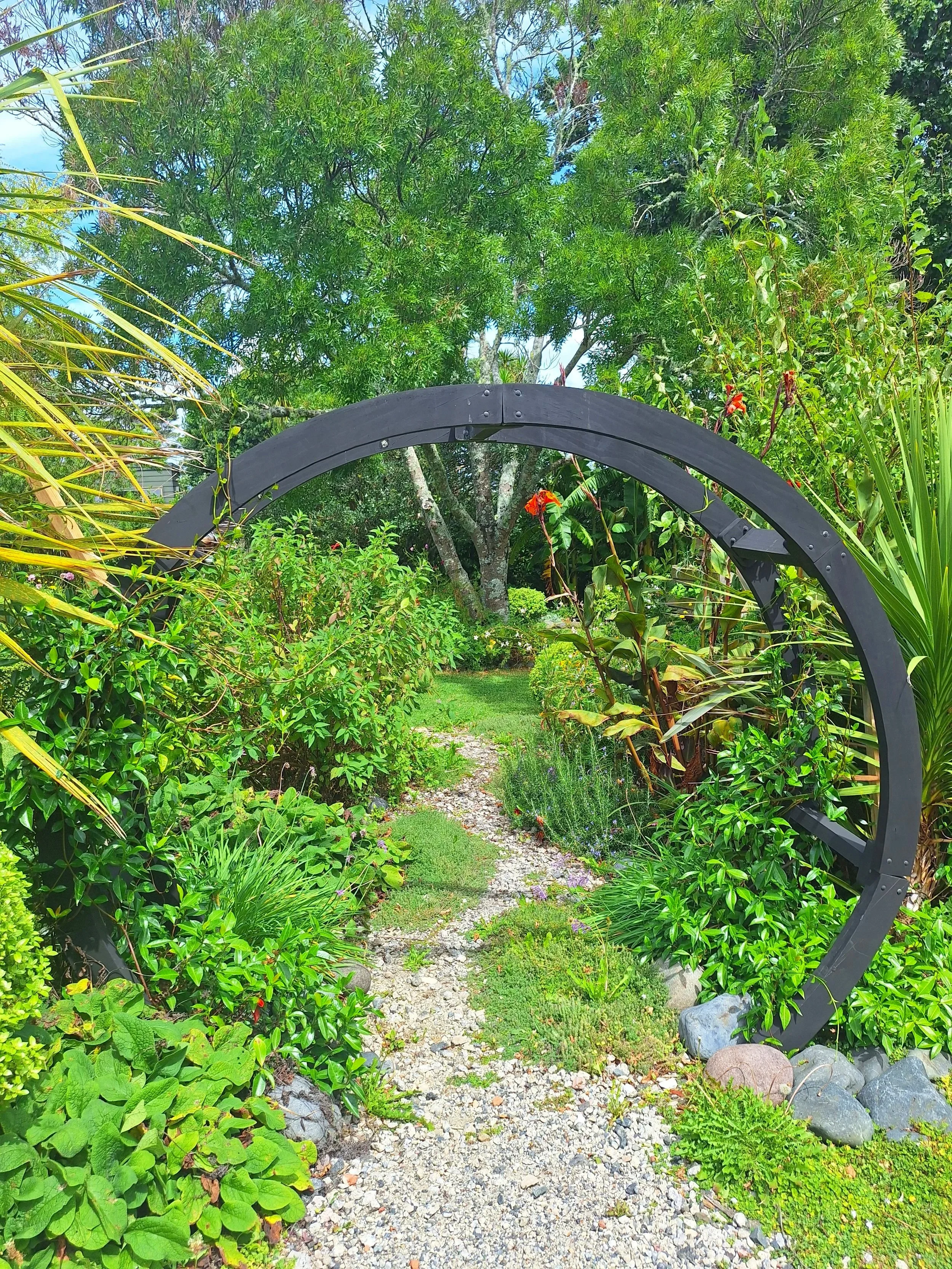 There is a greenhouse to sow seeds and propagate cuttings and two moon gates - one at the entrance and the other over a memorial seat.