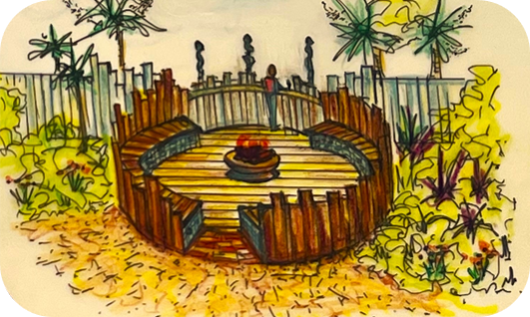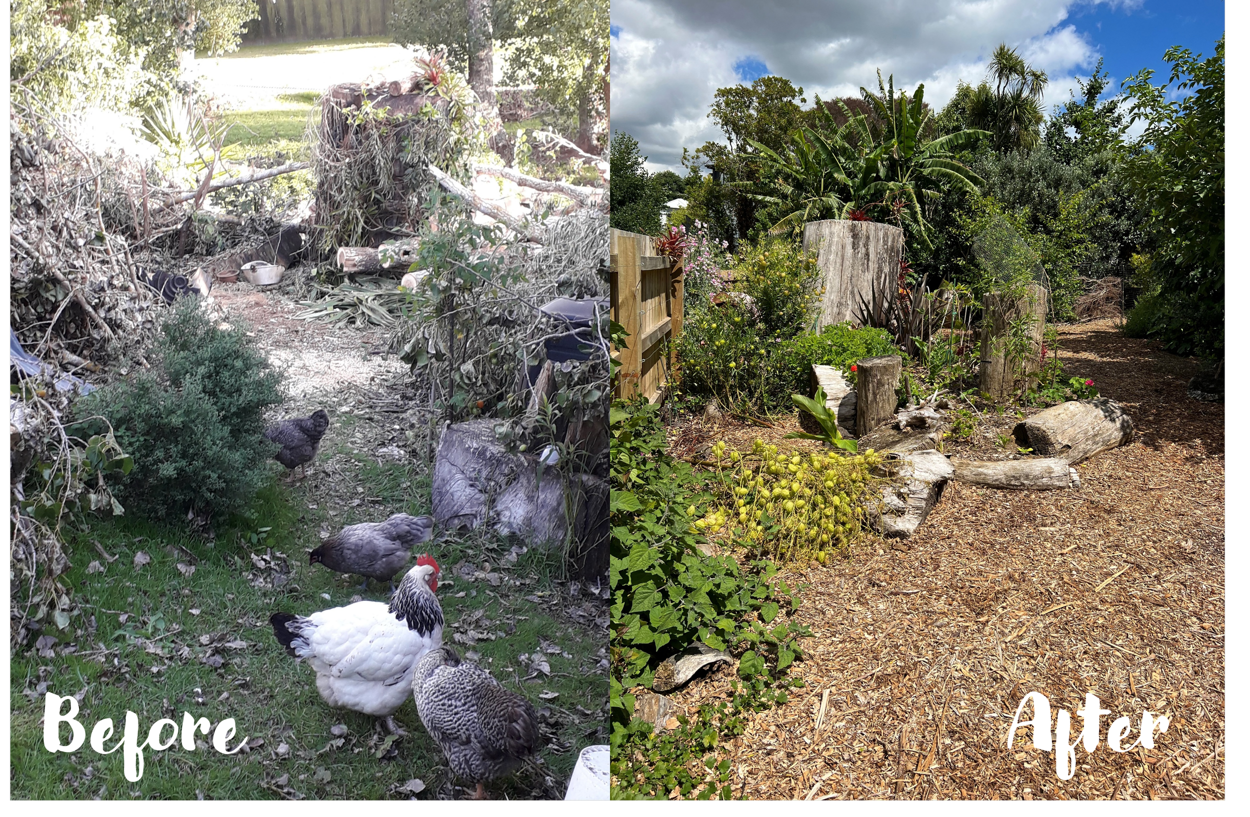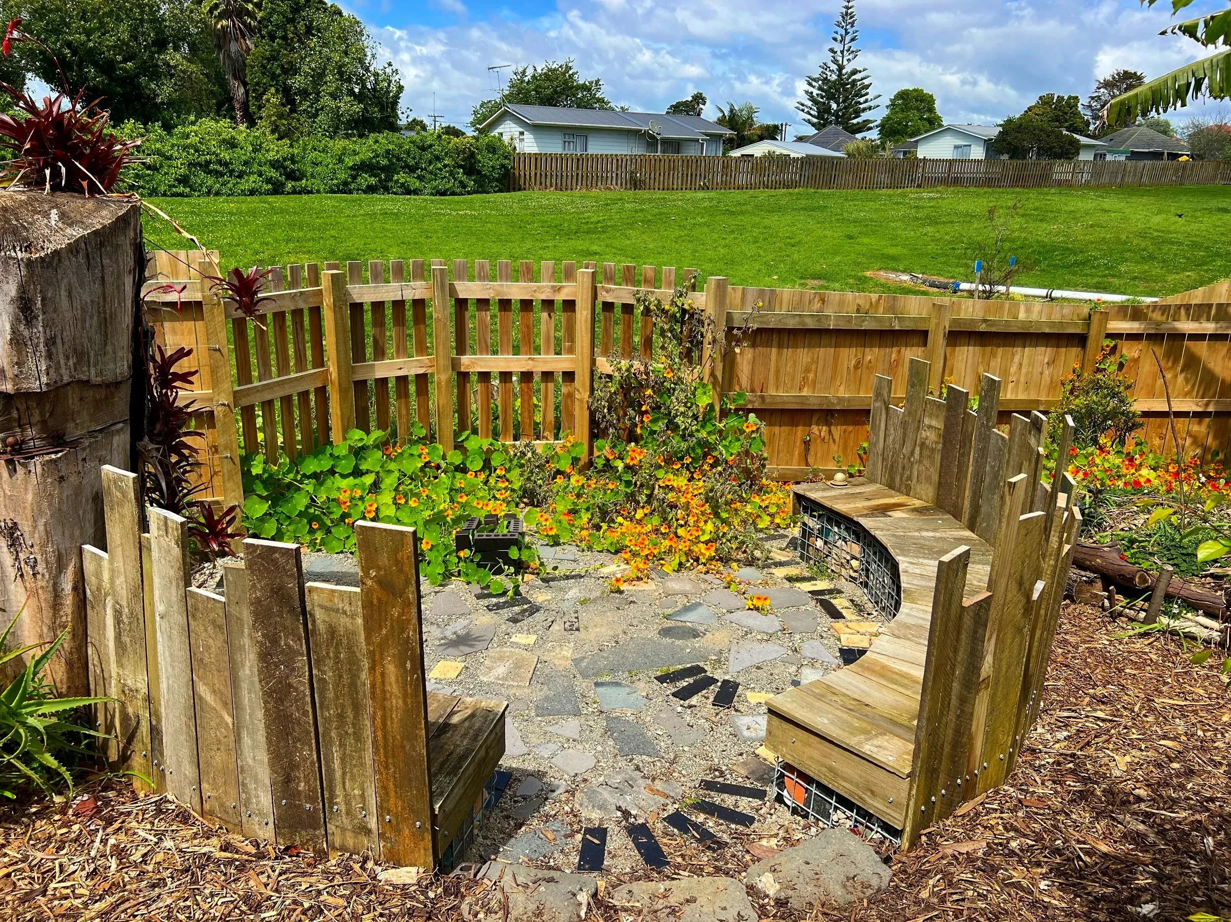 Following Cyclone Gabrielle where four massive poplar trees decimated the garden, the space became a "Gift the Garden" project with a revised design and planting plan and a “Permablitz' style working bee. Two weekends of serious soil moving (two truckloads rescued from the housing development across the road!), crushed concrete spreading, bench making, planting and mulch spreading!